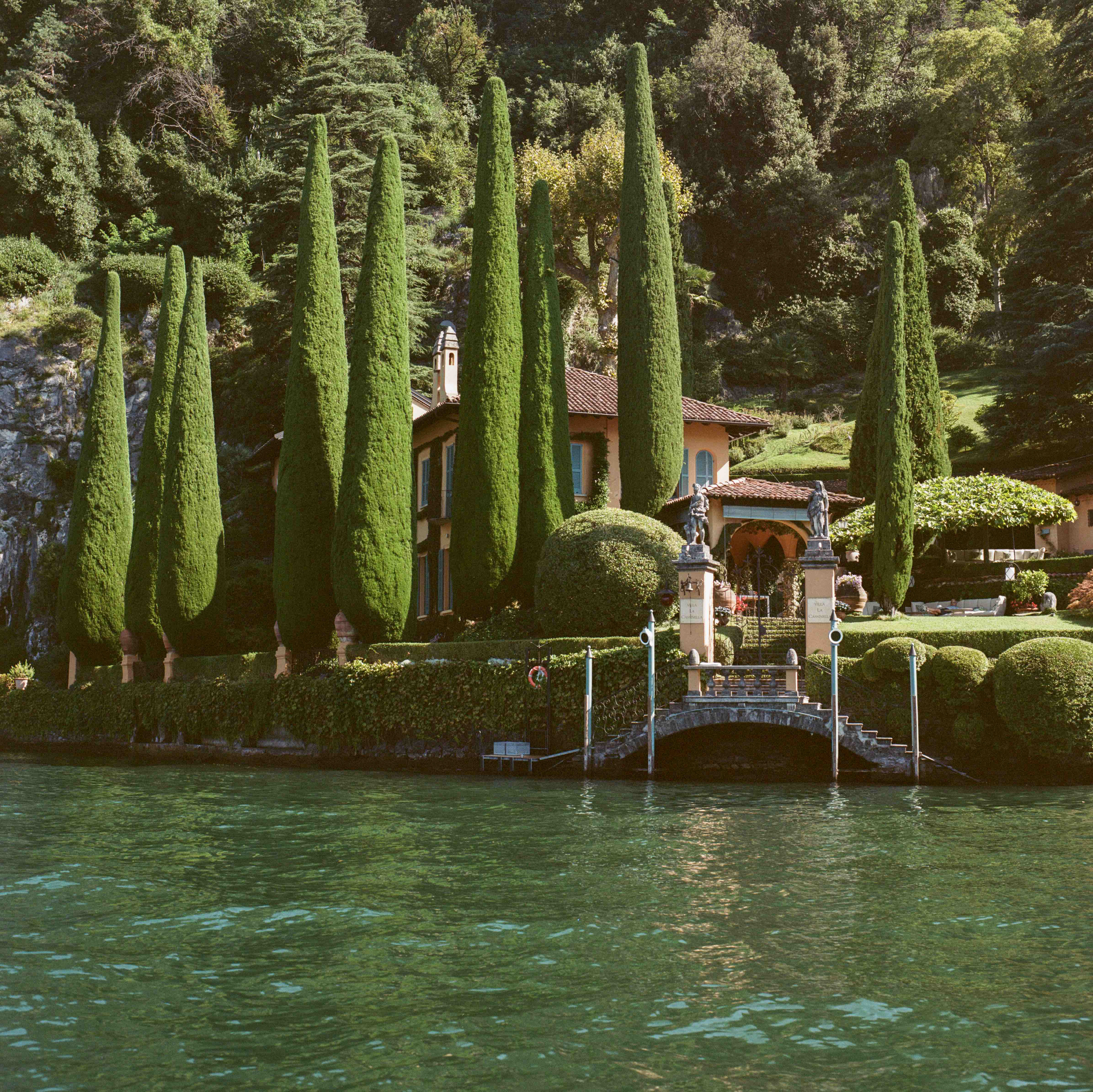 Captured from Lake Como, looking back toward Villa La Cassinella and its signature cypress trees. From this vantage point on the water, the villa reveals its relationship to the landscape. Perched between lake and mountain, its gardens descend to meet the water. The cypresses stand as vertical punctuation against the horizontal expanse of Como, their dark silhouettes creating the contrast that has made this one of the lake's most recognisable profiles. This is the view that has launched a thousand photographs, yet on film it takes on a timeless quality, as if the scene could be from any decade of the past century.